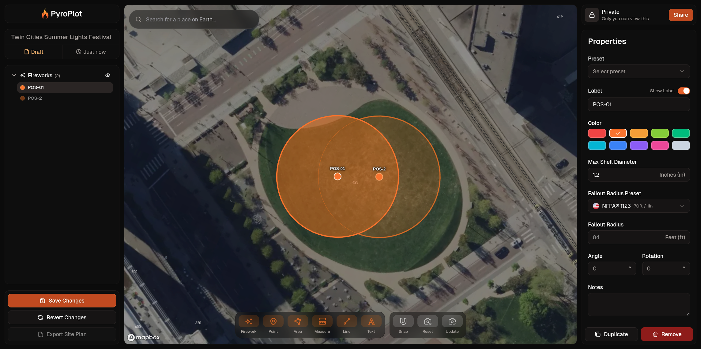 Manually running these calculations for every device in a multi-product show takes time — and leaves room for error. Pyro Plot's Site Plan Designer automates this. When you place a firework annotation on the map and set the shell diameter, the fallout radius is calculated automatically using your chosen preset — including the NFPA 1123 standard of 70 ft/in, the NFPA 1123 non-breaking standard of 35 ft/in, or a custom value. Fallout circles render live on the map, and you can switch between Separate, Combine, and Hybrid display modes to visualize how zones overlap across your entire show layout.