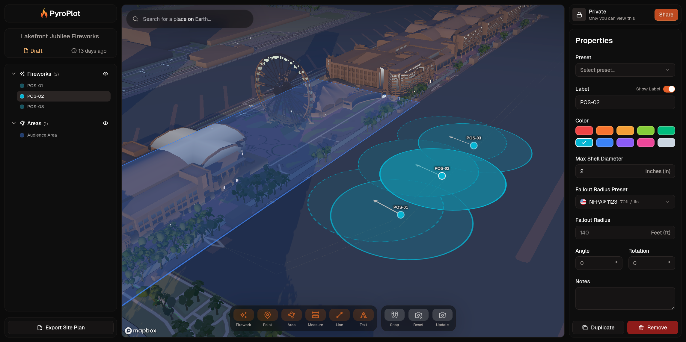 Pyro Plot is a planning and organizational aid — it doesn't replace your professional judgment or guarantee regulatory approval. But it does cut the time it takes to produce an accurate, well-documented site plan.